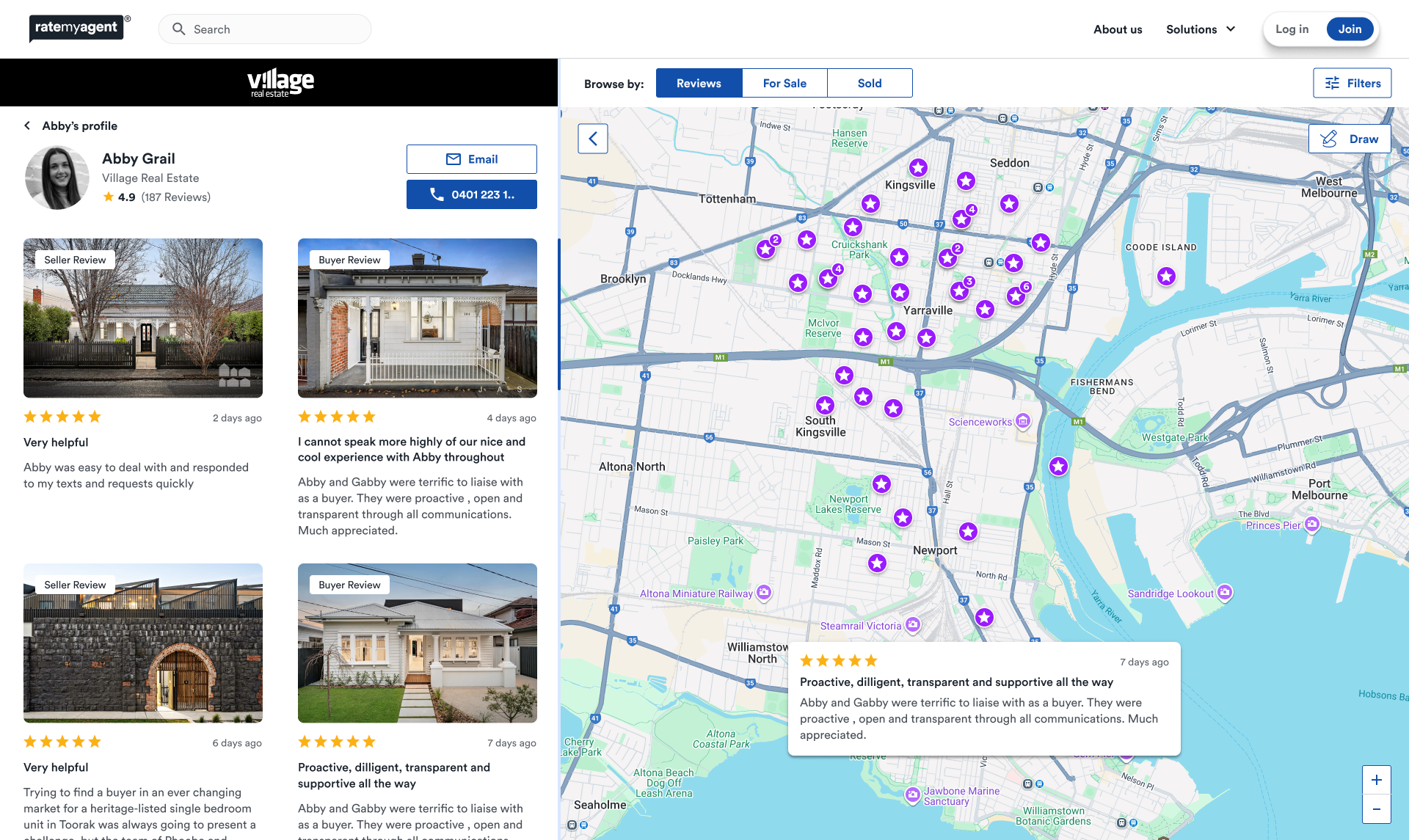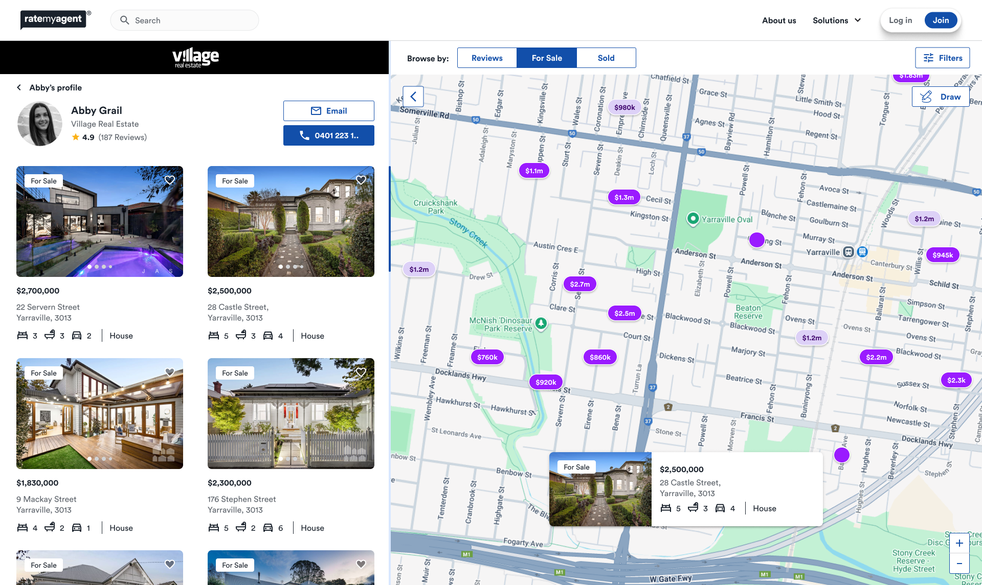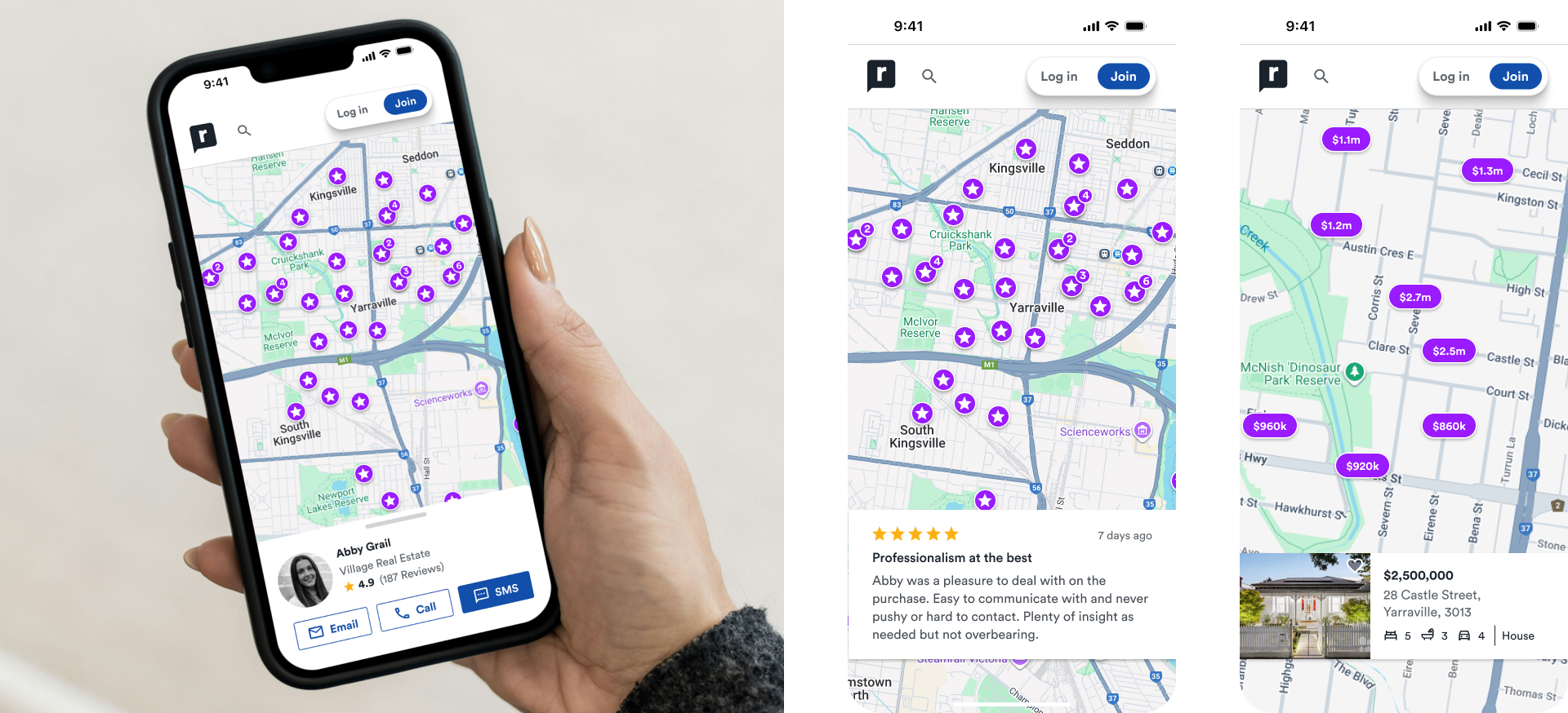 To extend the value of agent profiles and meet the needs of spatially oriented users, I designed a premium interactive map experience that enables buyers and sellers to explore agents by location. Developed as a visual discovery tool, the map provides geographic context to performance, reviews, and listings. Making it easier for consumers to identify trusted agents who are active in the areas they care about.