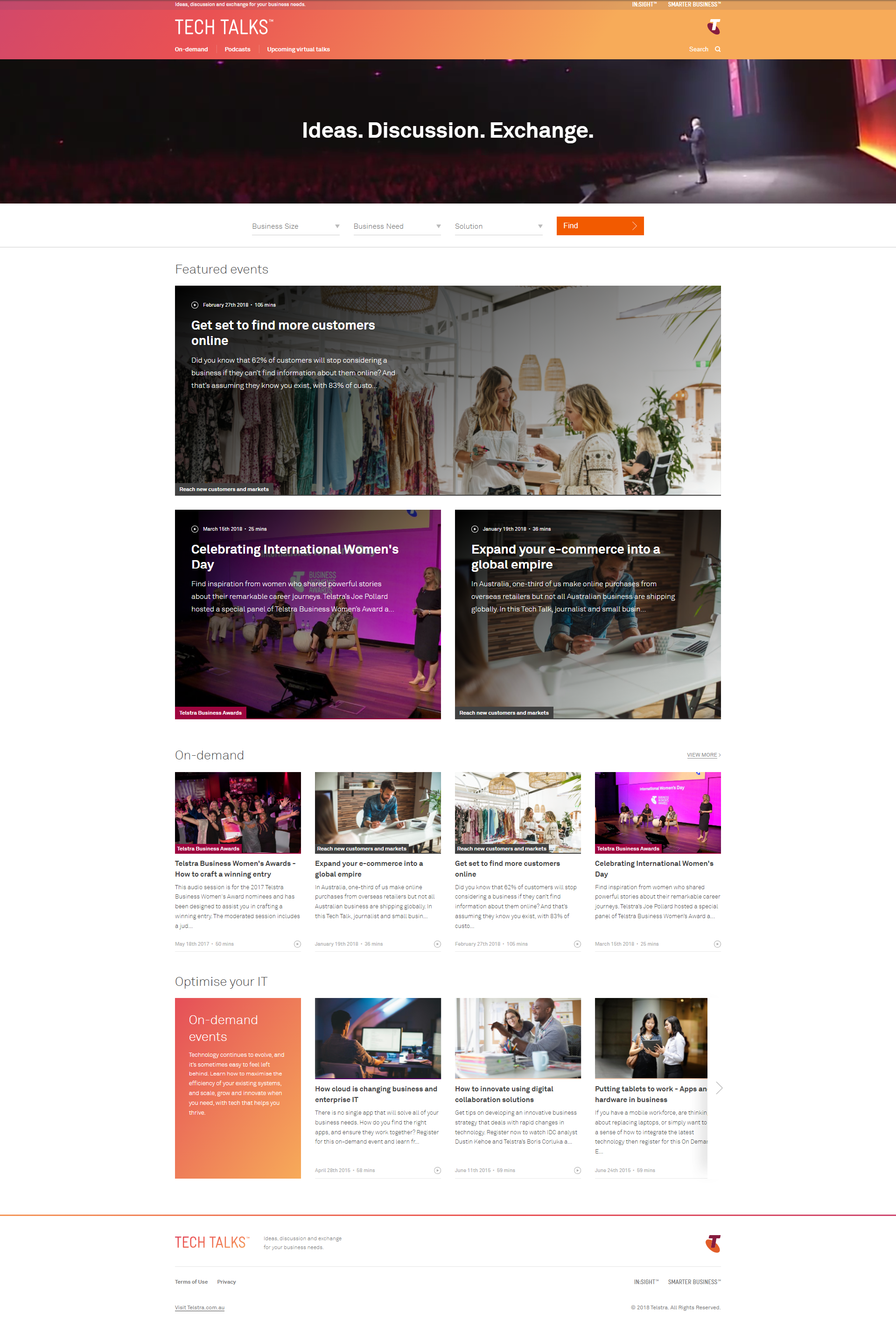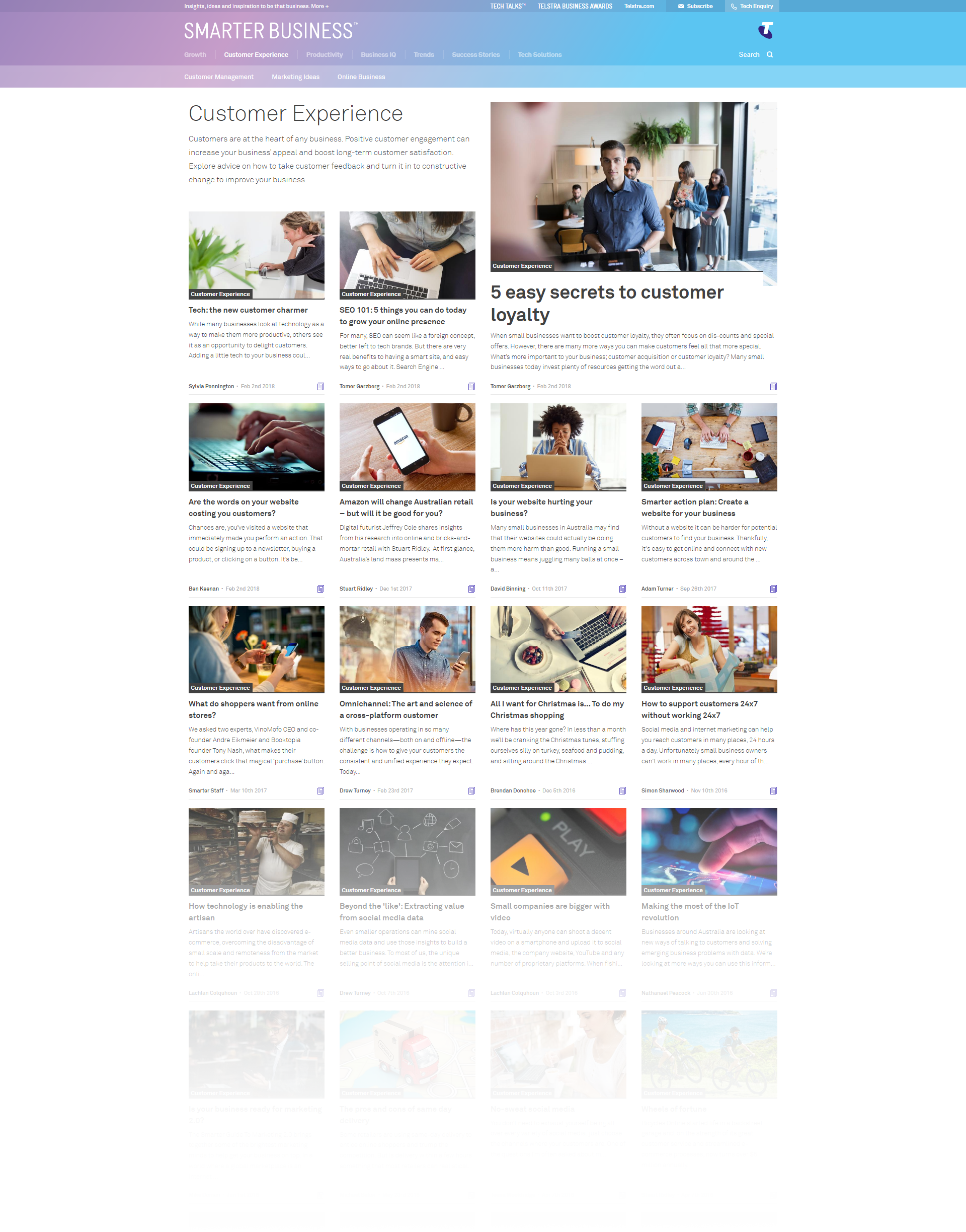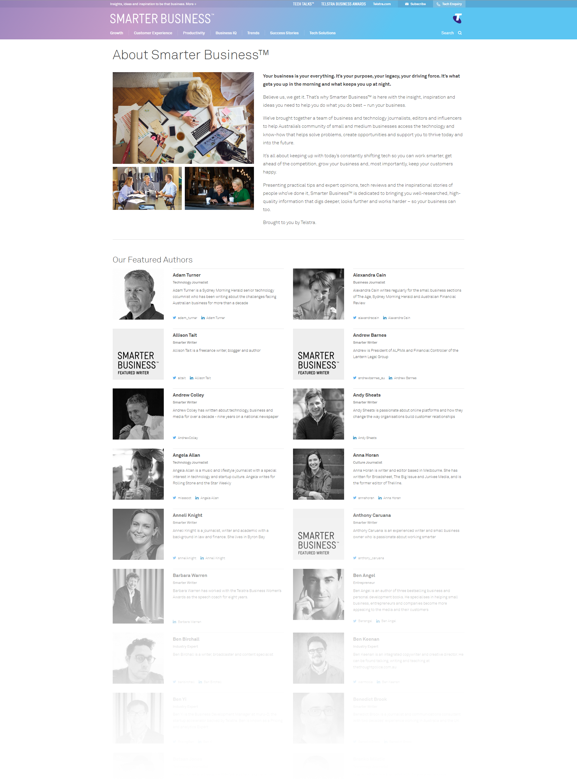 I designed the website for Smarter Business Ideas, Telstra’s thought leadership platform for Australian small businesses. It’s the first site in Australia to offer a comprehensive mix of expert advice, inspiring case studies, practical tips, and tools—all tailored to help small businesses thrive.